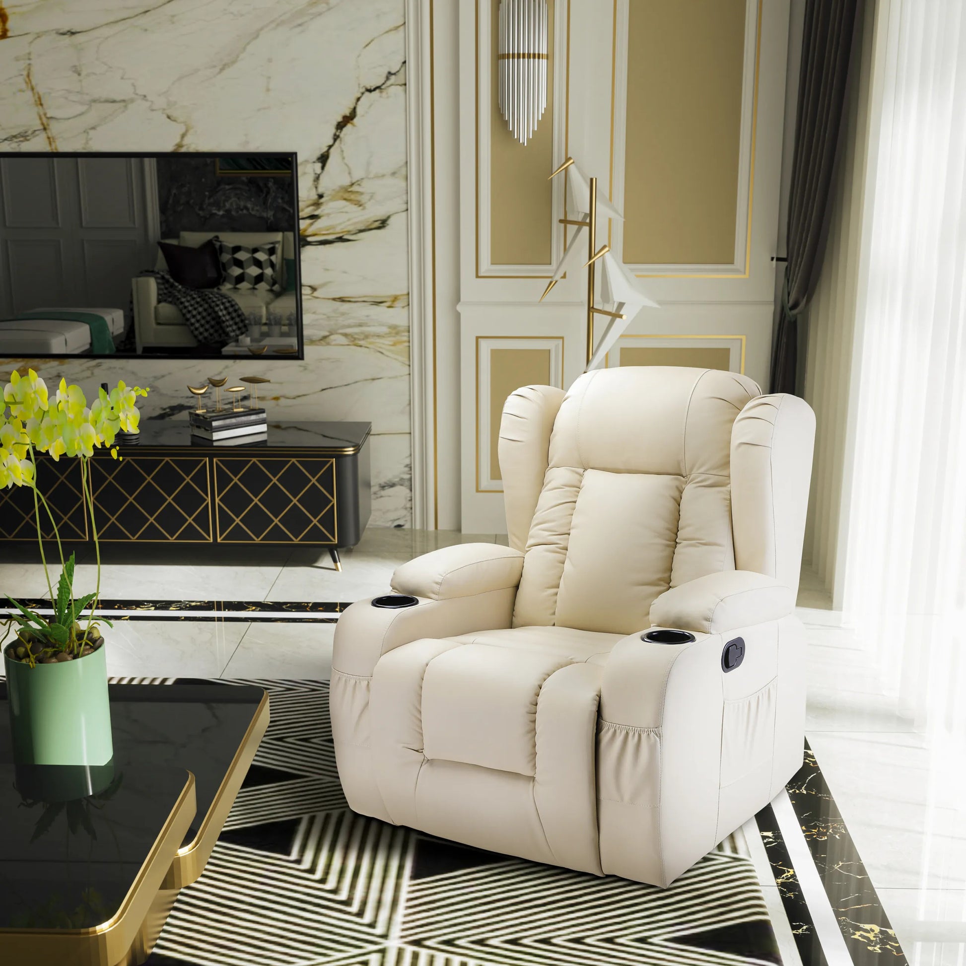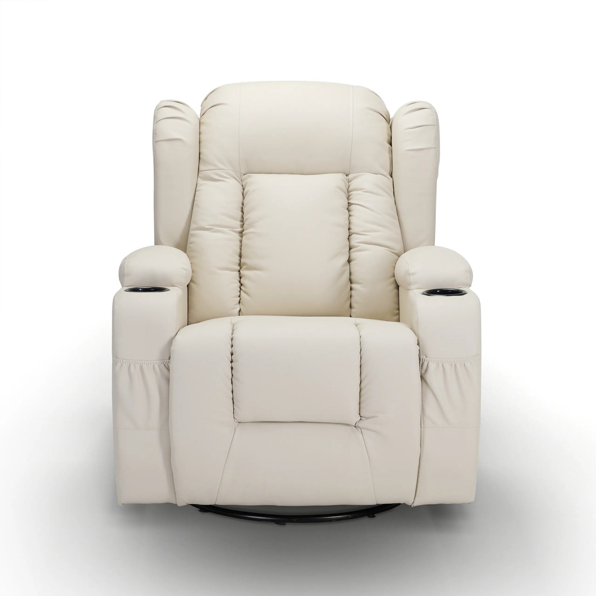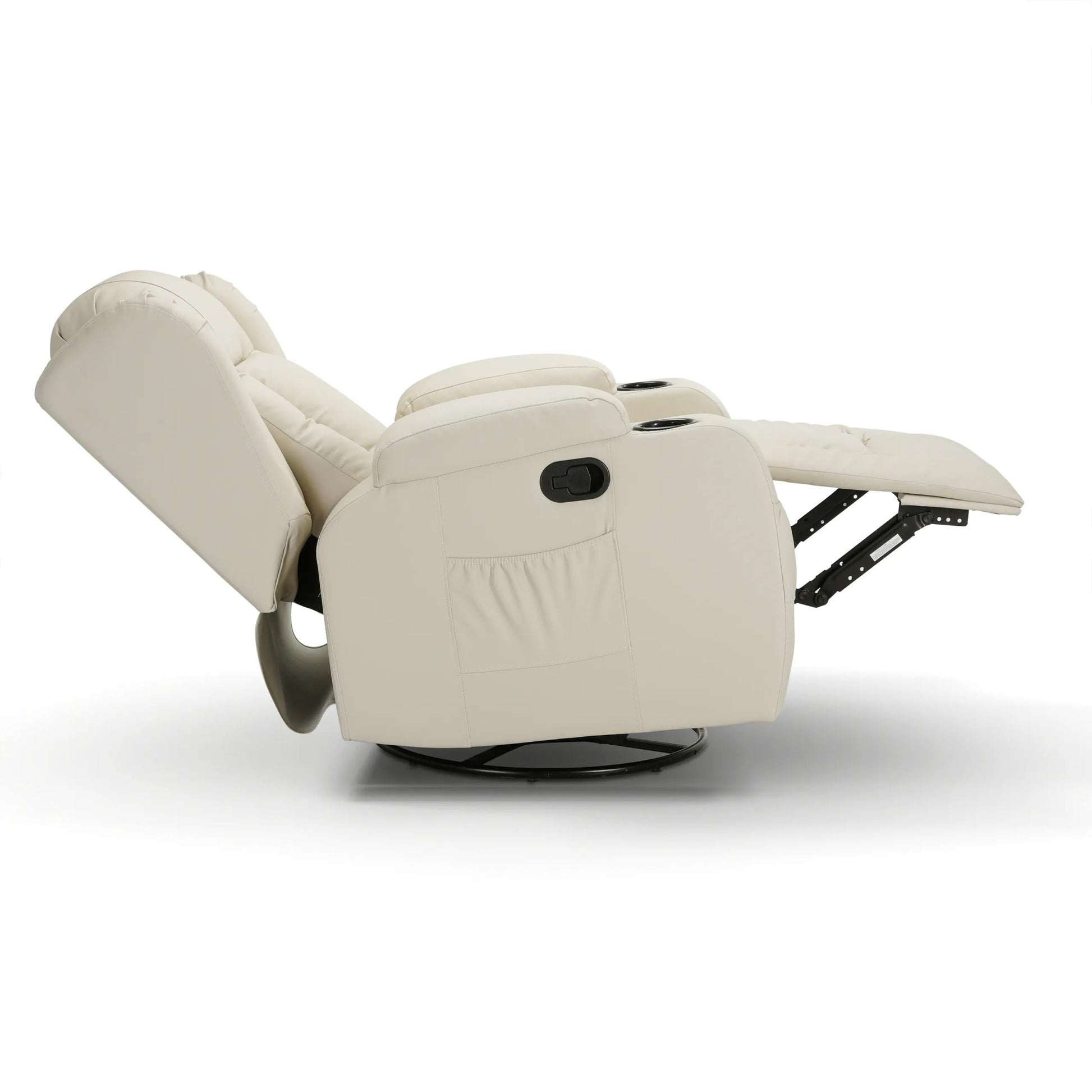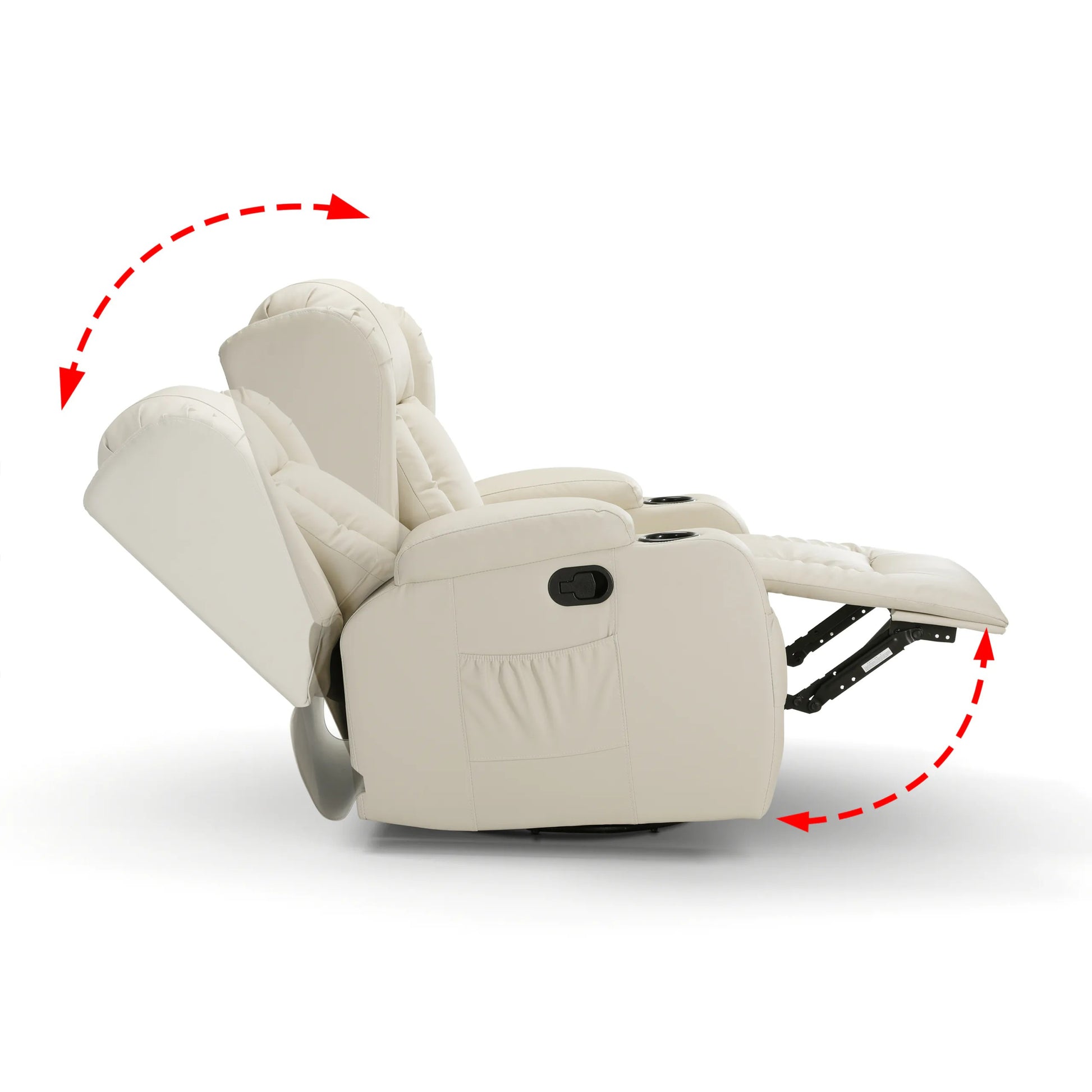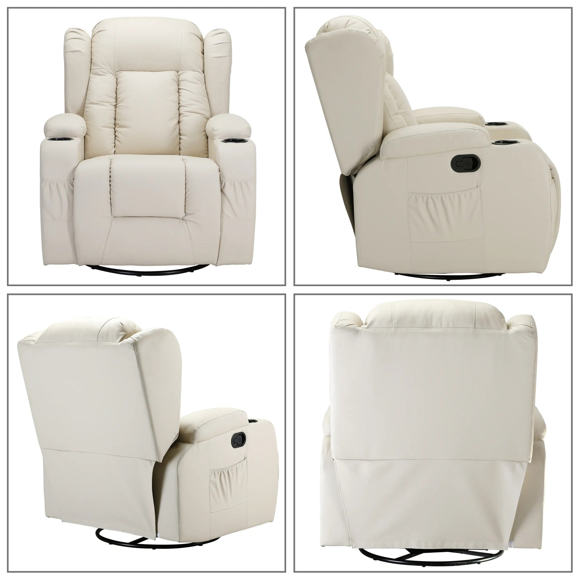 Kvaliteetse kunstnaha polsterdusega ning tihke pehmendusega istme ja seljatoega pöörlev tugitool pakub ülimat mugavust. Tugitoolil on pöörlev süsteem, mis võimaldab toale 360-kraadist vaadet. Kiikuval massaažitoolil on 8 massaažisõlme kogu keha lõõgastamiseks. Tänu soojendusele kiirgab tugitool mugavat soojust, mis vähendab pingeid. Selja- ja jalatuge saab vastavalt vajadusele erineva nurga alla seada. Komplekti kuuluvat pulti saab massaažitooli küljetaskus hoida.